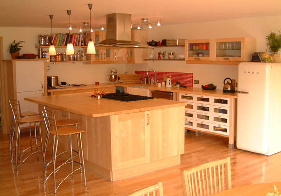The ground floor was extended right across the front of the house. The garage was converted into a new playroom and the old playroom, kitchen and utility room were combined to form one large family room / kitchen. The first floor was extended over the old garage to make a new master bedroom and bathroom.