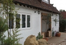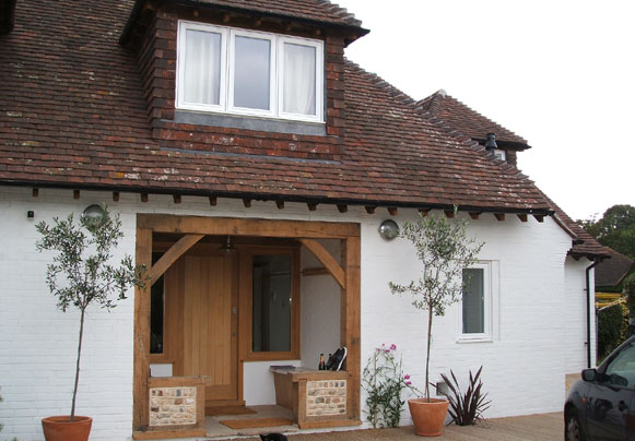 The extended roof retains the character and scale of the original, and includes new dormer windows, with timber casement windows. At the front of the house, the painted brickwork walls are offset by a new porch with traditionally detailed oak framing.