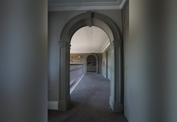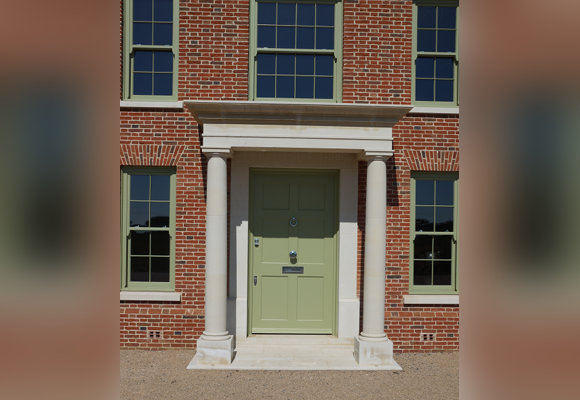 Great care was taken in the design and detailing to create a house of real quality, that included many traditional features. The materials were very carefully chosen: the bricks are small handmade bricks, and the detailing includes special brick arches, and a beautiful pediment over the front entrance. The Hall includes a stone staircase and lovely panelled walls and arches.