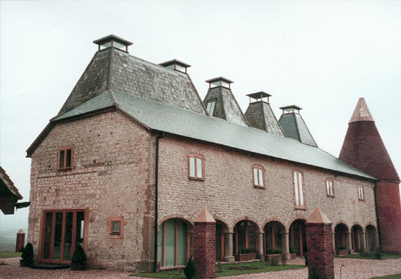 The kilns were renovated, the existing colonnade was glazed, two upper floors were inserted and the round-oast was reconstructed and re-roofed. A glazed extension was added, with a balcony above to enjoy the panoramic views.